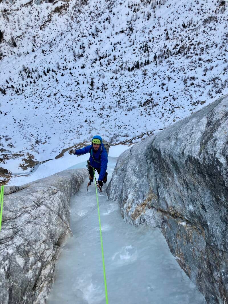 Una di queste è una delle linee più incredibili che io abbia mai visto, una colata di ghiaccio di circa 100 metri e larga poco meno di un metro, circondata da placche lisce, esteticamente perfetta!